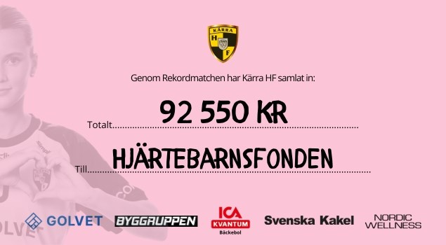 Vi har nu summerat alla våra insatser kopplat till Rekordmatchen och vi landar på hela 92 550 kr till Hjärtebarnsfonden! En helt otrolig siffra som vi kan vara mycket stolta över. -Det Kärra Handbollförening lyckades med är i sig ett rekord. Att samla in så mycket pengar är en otrolig bedrift och inspiration till andra. De här pengarna kommer att göra skillnad för våra hjärtebarn i Sverige. Före, under och efter deras svåraste tid, säger Mattias Barsk, marknadschef på Hjärtbarnsfonden. Den kraft, energi och det engagemang som visats i och omkring vår förening är inget annat än fantastiskt. Kärra HF är mer än handboll. Stort tack till alla som bidragit på olika sätt. Vi vill också passa på att lyfta de sponsorer och företag som stöttat: Golvet AB, 25 000 kr Byggruppen, 5 000 kr Nordic Wellness, 5 000 kr ICA Kvantum Bäckebol, 5 000 kr Svenska Kakel, 5 000 kr Hjärtligt tack! Tillsammans får vi fler små hjärtan att fortsätta slå.