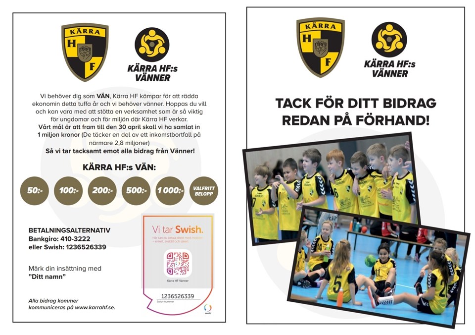 Vi behöver dig som VÄN, hjälp Kärra HF detta tuffa år, se mer i vår video. Hoppas du vill och kan vara med att stötta en verksamhet som är så viktig för ungdomar och samhället där Kärra HF verkar. Vi tar tacksamt emot alla bidrag från Vänner! (Bilden finns även som pdf) BETALNINGSALTERNATIV Bankgiro: 410-3222 eller Swish: 1236526339 Märk din insättning med ”Ditt namn” Alla bidrag kommer kommuniceras på www.karrahf.se F16 25 nov 2020 0kommentarer