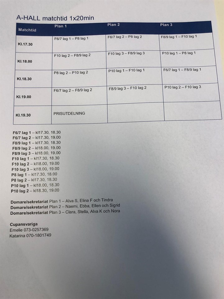 Tjo! Nu är lagen uppdelade och såhär ser det ut inför morgondagen. Lag 1: Maja, Alicia, Ellen, Lilly, Mira, Wilma, Julia, Vendela Lag 2: Stella Ö, Nova, My, Evelina, Malou, Esmeralda, Sanna, Leia Lag 3: Edith, Ella, Alwa, Inez, Stella FS, Sonia, Linette, Elsa (spelschemat ser ni nedan) Fiket bemannas av Carola, Anna K och Jenny/Johan (räcker med en av er) Se till att tjejerna äter ordentligt innan då det blir en lång kväll! Kom även ihåg att meddela i så god tid som möjligt om det uppstår förhinder. Hoppas ni är lika taggade som vi är på en rolig handbollskväll! :) Ses imorgon! //Linn, Elin, Katarina, Anne.Laila