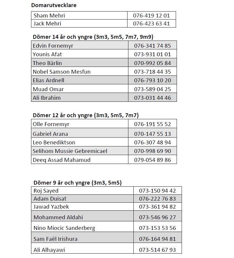Nu har vi uppdaterat kontaktlistan för er domare som ska skickas ut till lagen så att ni kan få uppdrag, ni ser listan som bild i den här nyheten (klicka på bilden för att få upp hela). Jag vill att ni alla tittar igenom listan och kollar så att uppgifterna stämmer. Kommentera nedan om något är fel, på måndag skickas listan ut.