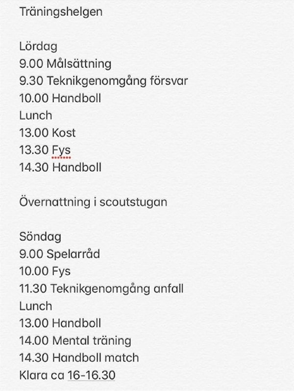 Här kommer schemat för träningshelgen! Vi får lunch och mellis serverat i hallen eller klubbstugan. Middag och frukost äter vi i scoutstugan. Kan som alltid vara bra med en frukt om ni vill ha det. 🍇🍉