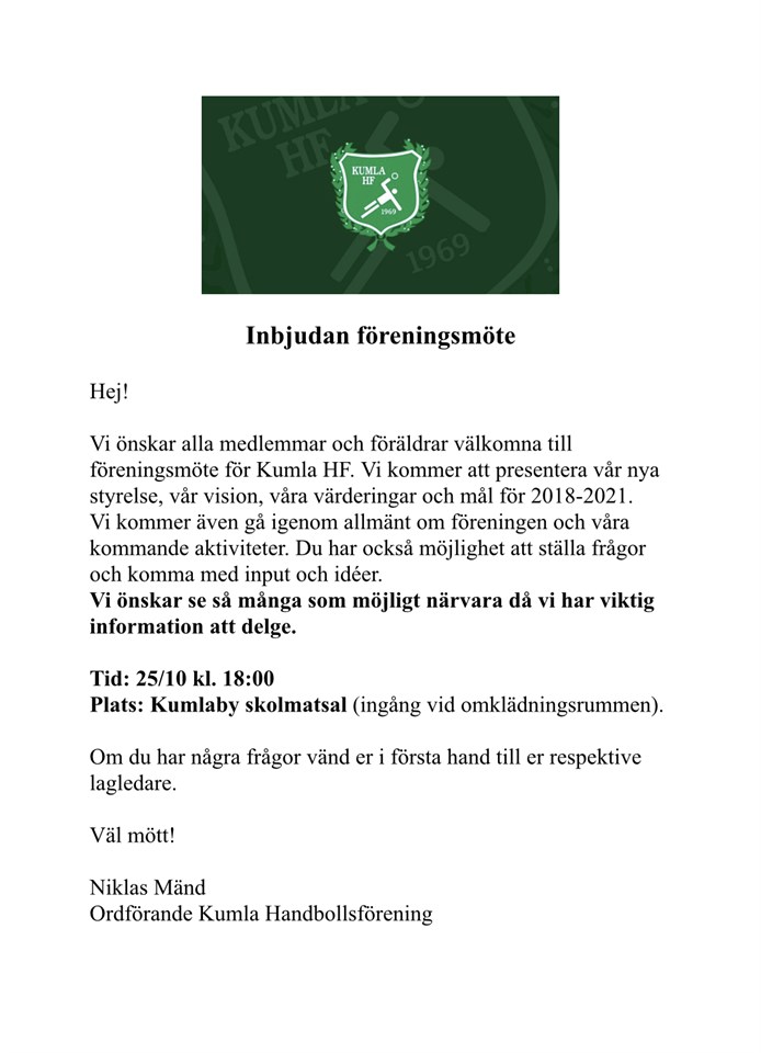 Det här mötet anser jag vara jätteviktigt för föreningens framtid. Så jag ser gärna att alla deltar på detta. Niklas Kumla HF 9 okt 2018 0kommentarer