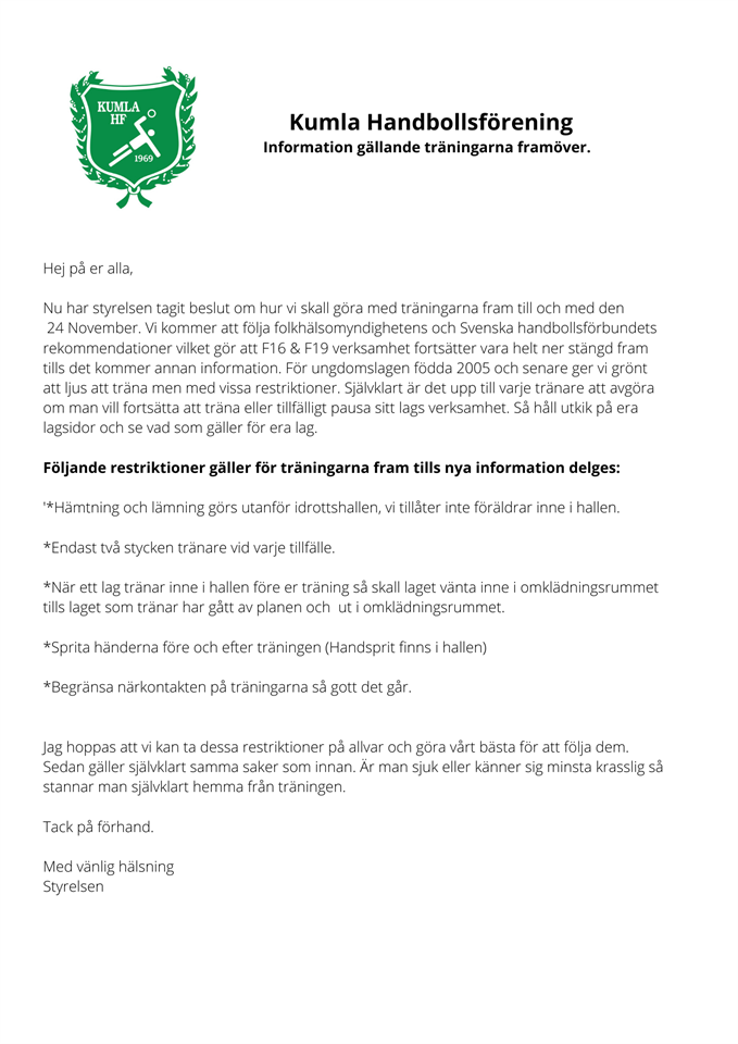 Hej på er alla, Här kommer lite information gällande de nya restriktionerna som gäller från och med idag och fram till den 24 November. För F16-19 ställs verksamheten in helt och hållet till den 24 November. För övriga lag gäller följande. Styrelsen har beslutat att ställa in innevarande veckas (v45) träningar även fast barn födda 2005 eller senare skall kunna träna enligt folkhälsomyndighetens och svenska handbollsförbundets rekommendationer. Detta för att vi skall se över hur vi skall kunna hålla igång träningarna på bästa tänkbara sätt. Alla matcher som skall spelas under de kommande 3 veckorna skjuts upp. Vi återkommer med mer information under helgen angående fortsatta träningar. Mvh Styrelsen Kumla HF 3 nov 2020 0kommentarer