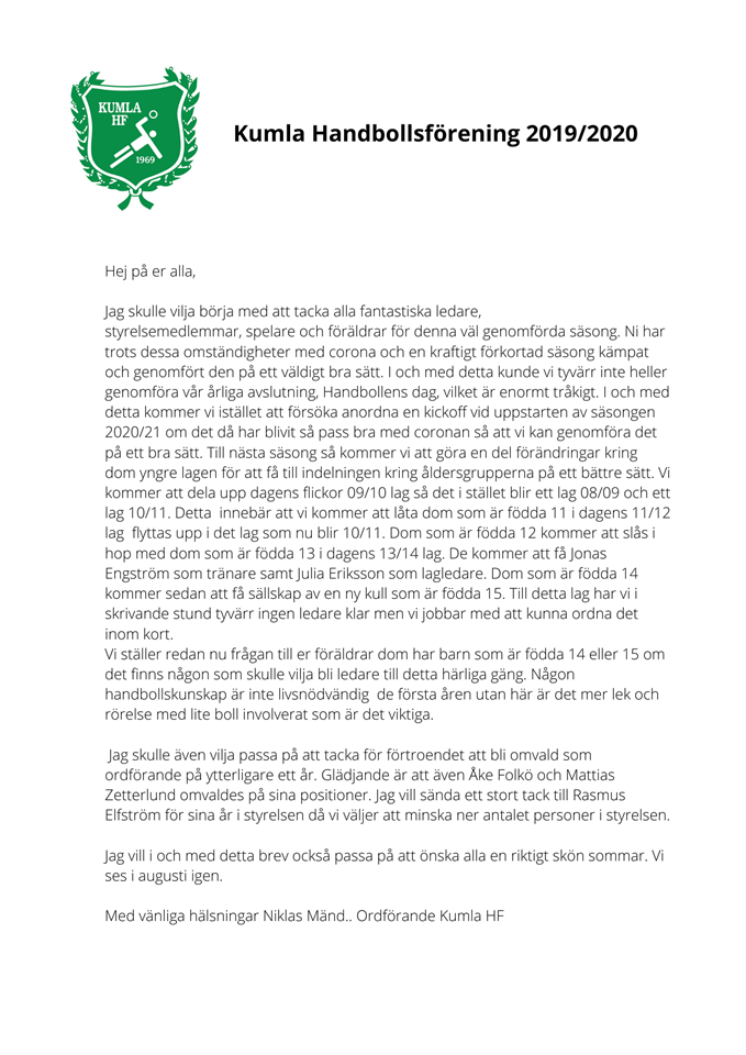 Härmed vill jag passa på att tacka alla för en fint genomförd säsong och önska er alla en riktigt skön och fin sommar. Kumla HF 16 jun 2020 0kommentarer