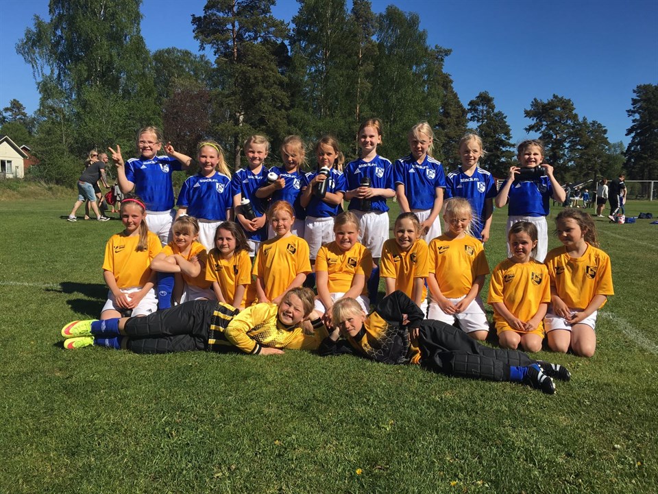 Idag spelade 22 supertaggade tjejer match mot Hultsjö IF Atom. Vi var uppdelade i två lag och Hultsjö likaså. Alla tjejer fick alltså spela två matcher var. Vädret var verkligen på vår sida och tjejerna storspelade! Vi ledare kunde inte vara stoltare! Vi passade bra, spred ut oss på planen och hittade våra positioner. Kanonbra! Vi fick dessutom känna på att göra mål och vissa hade redan hunnit öva in målgester :) Vi ledare vill också passa på att tacka alla föräldrar som ställde upp och bakade, kokade kaffe och stod i kiosken! Även ett stort tack till all publik som kom och kollade, och domarna som gjorde ett jättebra jobb. TACK! Vi ser med glädje fram emot nästa poolspel som kommer spelas helgen den 17-18/6. Vi vet inte plats, dag eller tid ännu men återkommer med det så fort vi fått mer info från Smålands fotbollsförbund. Mvh Ledarna