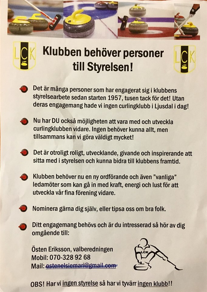 Gävle Dala Curlingförbund inbjuder till en konferens där klubbarna får möjlighet att forma distriktets arbete. Orbaden Spa & Resort den 12-13 maj 2017 Program Fredag 12 maj ca 1800 med diskussioner och middag lördag 13 maj 0900 konferens 1200 lunch Ca 1500 avslutning Vad vill klubbarna? Tävlingsverksamhet? Kurser, läger och annan verksamhet? Utveckling av juniorcurlingen i distriktet? Styrelsesammansättning och styrelseansvar? Kostnad 1000 kronor per deltagare (klubben betalar) intresseanmälan till Lena Olofsson senast 1 april lena.olofsson@ljusdal.se Ljusdals CK 16 mar 2017 0kommentarer
