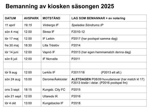 Ikväll spelar herrlaget mot IS Halmia i DM. Styrelsen bemannar kiosken. På lördag har P2016 ett poolspel och på söndag spelar herrarna match igen, bara för att nämna några av alla aktiviteter som är på gång på Alevallen. När herrarna spelar match turas ungdomslagen om att bemanna kiosken. Första laget att bemanna blir F2010-12.