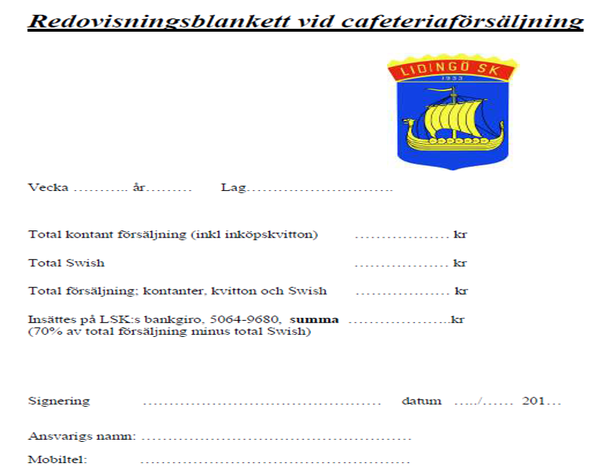 Då var det dags för oss att bemanna Cafeterian nästa mån, ons, fre & sön. Kul! Jag ber de föräldrar som ansvarar för stängningspassen respektive dag att räkna dagskassan, fylla i redovisningsblanketten (se bild, denna blankett finns i en pärm i cafeterian) samt överlämna dagskassan och redovisningsblankett till undertecknad på söndag vid vår handbollsmatch. mvh/ JK Head of Cafeteria Coordination