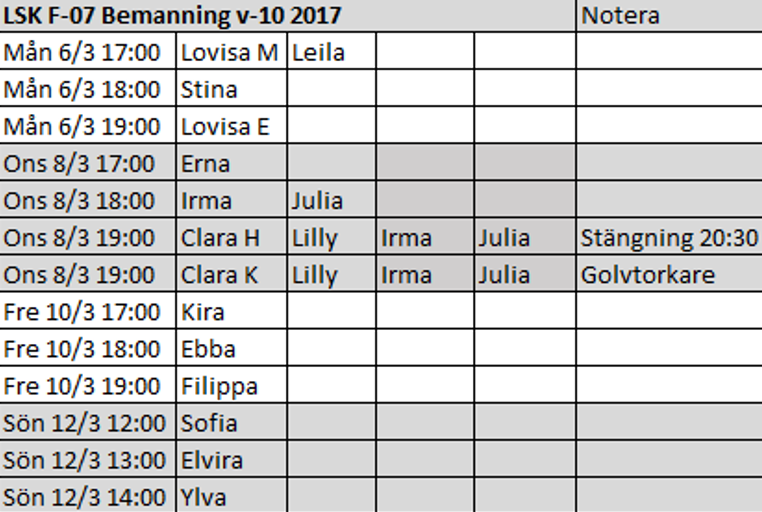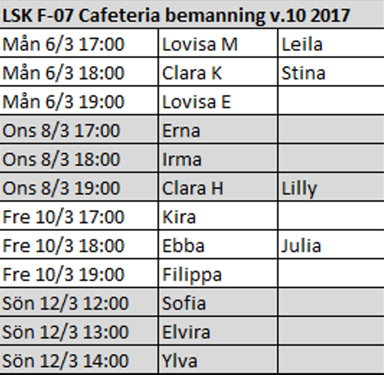Howdy, följande 1-timmespass behöver bemannas av oss i Cafeterian under vecka 10. Mån 6/3 kl 17 Mån 6/3 kl 18 Mån 6/3 kl 19 Ons 8/3 kl 17 Ons 8/3 kl 18 Ons 8/3 kl 19 Fre 10/3 kl 17 Fre 10/3 kl 18 Fre 10/3 kl 19 Sön 12/3 kl 12 Sön 12/3 kl 13 Sön 12/3 kl 14 VV välj en tid och skicka ett mail till kan.james@hotmail.com med spelarens namn samt önskad tid så försöker vi få till ett schema/ JK