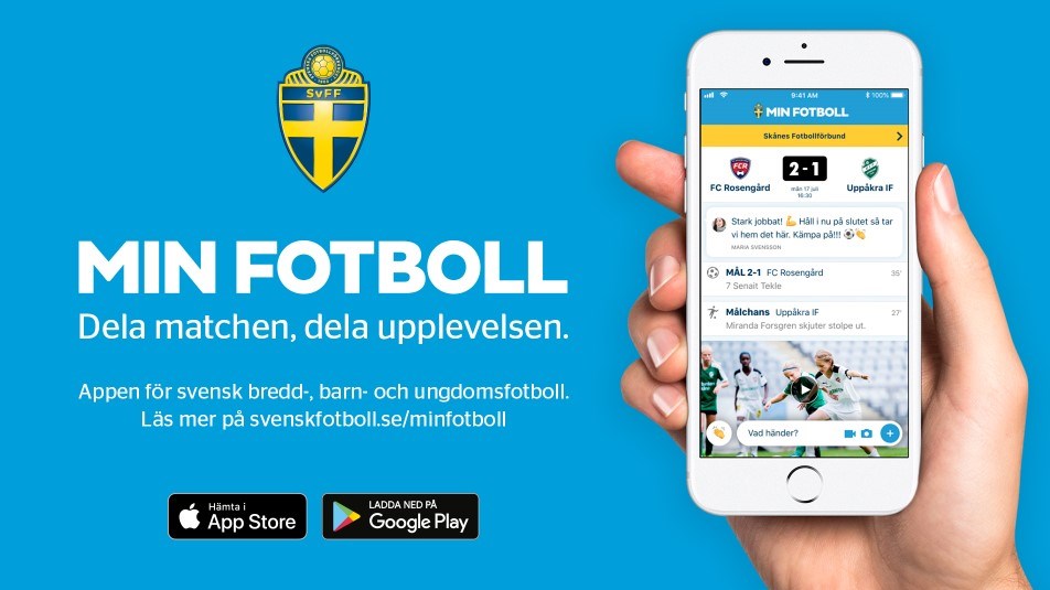 Min Fotboll är breddfotbollens alldeles egna sociala app som lanseras till säsongsstart. SvFF och distrikten står bakom den nya, helt fotbollsanpassade, digitala tjänsten som alla bredd-, barn- och ungdomslag kan använda för att skapa engagemang och uppmärksamhet kring sina matcher. Genom att ge spelare, ledare, föräldrar och supportrar möjlighet att dela filmklipp, bilder, referat, live-sändningar och resultatrapportering i appen kommer alla som är intresserade och stöttar ett lag att kunna följa och vara en del av allt som händer kring lagets matcher. Min Fotboll-appen är svensk fotbolls egen app oberoende av de stora sociala medieplattformarna, men med möjlighet att enkelt dela händelser och bilder i dessa om man så önskar. Min Fotboll är en lättanvänd app som används tryggt och säkert med beaktande av dataskydd, integritet och fotbollens värderingar. Lag och föräldrar kan själva styra vilka som får tillgång till lagets och spelarens information och bilder. Alla svenska bredd-, barn- och ungdomslag kommer fritt kunna använda appen. En inbjudan att ansluta sitt lag kommer att gå ut via respektive förening och till lagansvariga under säsongsupptakten. Testa appen redan idag, du hittar den där du vanligtvis brukar ladda ner appar.