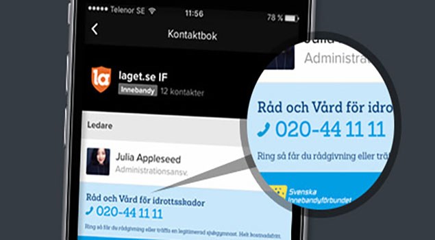 Prata med specialist på idrottsskador? Tjänsten Råd och Vård för idrottsskador finns nu som direktnummer i kontaktboken i laget.se-appen. Tjänsten är gratis för medlemmar i Svenska innebandyförbundet. Läs mer här