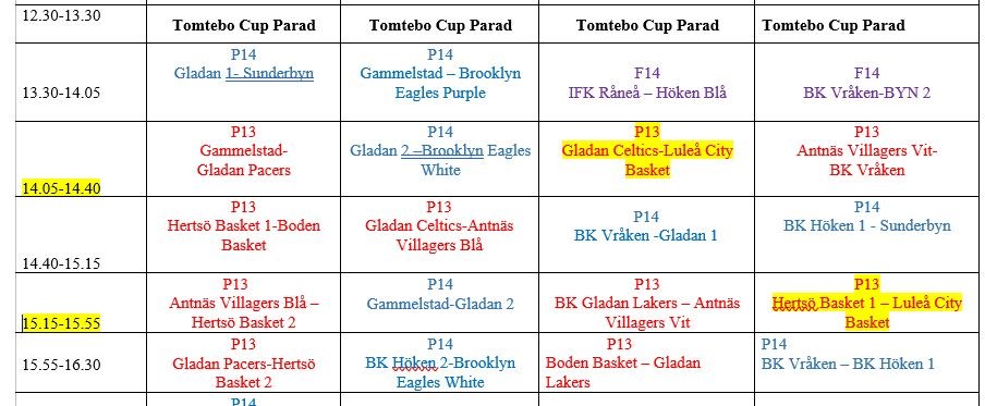 Hej! Här är info om Tomtebo Cup som spelas nu på torsdag 5/1 i Luleå energi arena. Matcher Våra matcher spelas på eftermiddagen, kl 14:05 och 15.15 Alla lag spelar två matcher var. Om man inte är med på invigningen (se nedan) så ses vi 13:15. Invigning 12:30 är det Tomtebop Cup Parad. För dom som vill vara med är det samling 12:20. 12.20 samlas alla lag i B-hallen för Tomtebo Cup paraden! Speakern kommer ropa upp lagen i tur och ordning och lagen springer in i A-hallen och ställer sig lagvis. Under invigningen kommer spelare från våra elitlag vara på plats och bilda tunnel vid presentationen. Ta med autografblock och penna! Regler: - Matchtid: 4 perioder x 5 min rullande tid, Byte efter 2,5 min (om man vill). - Inga protokoll - En förälder i sekretariat som tar tid och vänder pilen vid uppkastsituationer. Det är en förälder från hemmalaget (hemmalag är det lag som står först i spelprogrammet) - Man får inte ta bollen av en spelare som håller bollen med båda händerna - Glatt humör och respekt för motståndare, domare och varandra. Omklädningsrummen ligger på entréplan samt källaren, ta med värdesaker in i hallen vid match. Uppvärmningsbollar finns att låna. PF 13/14 2 jan 2023 0kommentarer