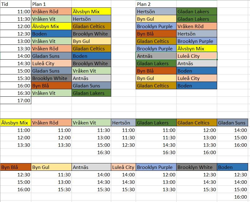 Hej Nu har vi fått spelschema för lördag 3 dec i Björkskatans Sporthall. Det blir tre eftermiddagsmatcher: 14:00 mot Antnäs 14:30 mot Brooklyn 15:30 mot Sunderbyn Håller tummarna att vi alla är friska och kan vara med! Samling 13.15. PF 13/14 28 nov 2022 0kommentarer