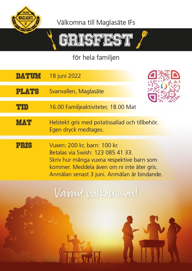 Nu är allt klart. Efter 2 långa år med pandemi och restriktioner kan vi nu äntligen ta upp vår fina tradition igen. Det blir sommarfest med helgrillad gris, potatissallad och tillbehör. Alla nya som gamla medlemmar är välkomna att anmäla sig, givetvis också familjemedlemar till våra medlemmar! Hoppas vi ses den 18 Juni på Svanvallen Mvh Maglasäte IF Maglasäte IF 24 maj 2022 1kommentar