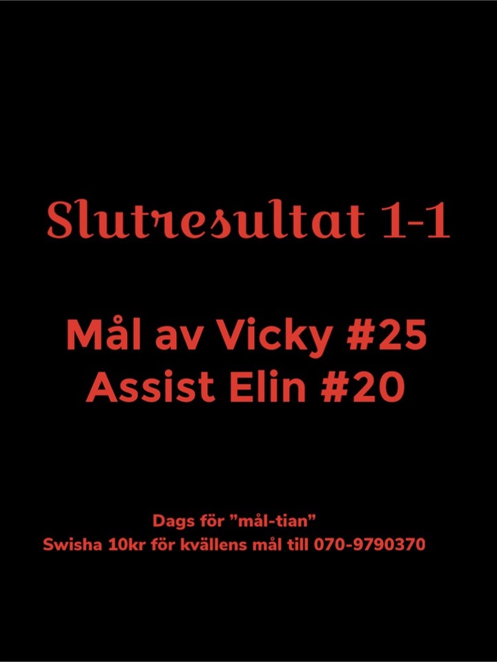 Då var premiären avklarad! En jämn match med högt tempo där vi tar ledningen med 1-0 genom Vicky. Mot slutet av matchen är det nära för ett 2-0 mål av Olivia men tyvärr lyckas Lindhagen reda ut den situationen. Med ca 15 sekunder kvar på klockan lyckas Lindhagen få in 1-1 målet som sedan blev slutresultatet. Vi tackar Lindhagen för en rolig match och blickar framåt till nästa helg då vi möter Stuvsta. I samband med säsongens första match har vi startat ”Mål-tian”, så för varje mål vi gör så kan man swisha 10kr till vår supporter swish. Så swisha 10kr för att gratta #25 mål för kvällen och samtidigt sponsra erat favoritlag! ❤️ Dam 25 nov 2019 0kommentarer