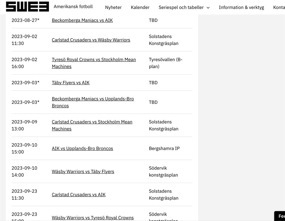 Så att alla vet. Matchschemat är ändrat och första match är ytoligtvis mot AIK den 27:e. Alltså nästa helg. Vi kommer uppdatera spelschemat i kalendern under helgen, men här kan ni se aktuell info för er serie. https://amerikanskfotboll.swe3.se/tabeller/u15-norra/ Glöm inte att sova, dricka vatten och äta så ses vi imorgon. U15 (2011-2012) 18 aug 2023 1kommentar