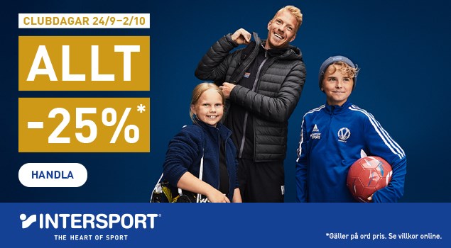 Hej på er! Mellan den 24/9 - 2/10 har vår samarbetspartner Intersport 25% rabatt på allt i butik och på intersport.se, ett perfekt läge att köpa det ni behöver för höstens alla aktiva dagar. Genom ett medlemskap i Club Intersport får du tillgång till unika erbjudanden samt bonus på alla dina köp. Välj Månsarps IBK som förening under ”Mina sidor” på intersport.se, då går 3% på allt du handlar hos oss tillbaka till vår förening utan att din egna bonus påverkas! Länk till Intersport, Intersport.se Vänligen, Månsarps IBK