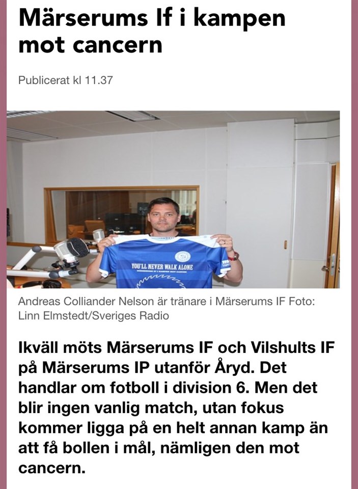 Fredagen den 8 maj möter Märserums IF - Vilshults IF på Märserums IP i div.6 västra Herrar. Detta kommer inte vara en "vanlig" match då fokus kommer att ligga på en annan kamp, den mot cancern. Vi i Märserums IF kommer att visa vårt stöd och hjälpa till i kampen mot cancern. När Sammy Colliander-Nelson, tidigare spelare i Märserum, för några år sedan drabbades av strupcancer var det flera av hans kompisar och familj som kände att de ville göra något. Därför startades det en insamling mot cancer och eftersom Sammy var ett stort fan av fotbollsklubben Liverpool fick den därför bära namnet "You'll never walk alone". På våra hemmamatcher framöver kommer vi därför att spela You'll Never Walk Alone när vi går in till match. Orden "You'll Never Walk Alone - Märserums IF i kampen mot Cancern" finns numera även på våra nya snygga matchtröjor. Eftersom Sammy stod många i klubben nära känns det bra att göra något för honom, något till hans minne och för alla andra som drabbas av denna hemska sjukdom. Det känns jättestort. Vår tidigare ordförande och damlagets mentor Michael Isaksson avled i denna sjukdom under hösten 2013 endast 51 år gammal. Detta är en av de viktigaste personerna i MIF under alla år. Som spelare, tränare, ledare och styrelseordförande. Även vår spelare Fredrik Levins cancerdrabbade sambo Amanda blev även hon utsatt av denna hemska sjukdom. Så det finns många runt föreningen som blivit påverkade. Vi kommer ha en sparbössa under hela året på Märserums IP så man kan skänka en slant. Så gör en god gärning och skänk en peng till cancerfonden, det kommer rädda liv! Ingen kan göra allt, men alla kan göra något! Vår förhoppning är att så många som möjligt sluter upp på Märserums IP den 8:e maj. Vi tror och hoppas att vi kommer att bjuda på ett extra stort och fint evenemang. Även de lokala tidningarna kommer att finnas på plats och föreviga evenemanget. You'll Never Walk Alone.. Märserums IF 1 maj 2015 0kommentarer
