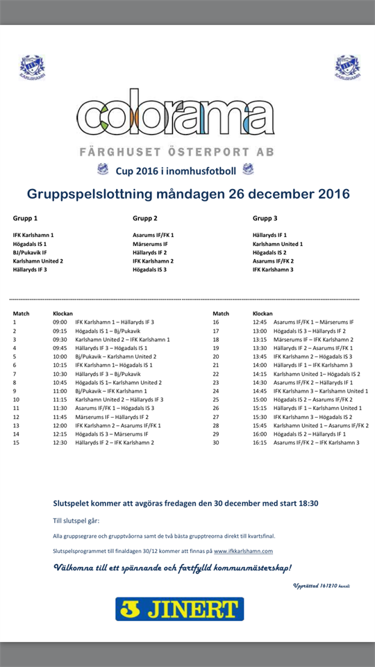 Colorama cup lottat 2016 Lottningen är nu klar till måndagens gruppspel 26/12. Väl mött den 26/12!