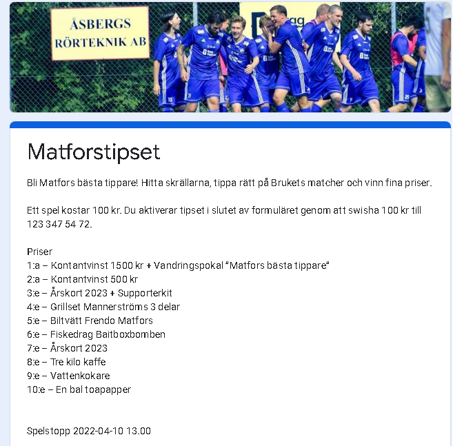 Ta chansen att bli Matfors bästa tippare samtidigt som du stöttar Matfors IF. För att delta klickar du HÄR A-lag Herrar 16 mar 2022 0kommentarer