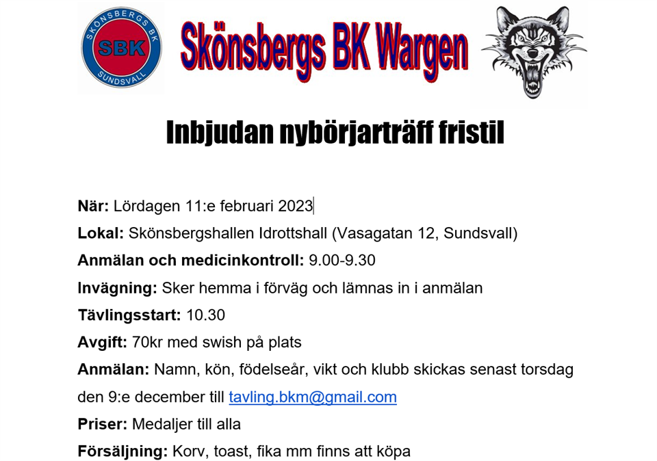 Kom ihåg att anmäla till nybörjartävlingen i Skönsberg 11 februari. Mer info finns i kallelsen. (anmälan sker genom att svara på kallelsen, klubben ammäler sedan alla deltagare till Skönsberg) Vid frågor finns Fredrik på träningen på torsdag eller så går det bra att kontakta oss på tel. enligt nedan. Hälsningar Fredrik 070-367 70 43 Petra 073-847 80 88 Pass 1 31 jan 2023 0kommentarer