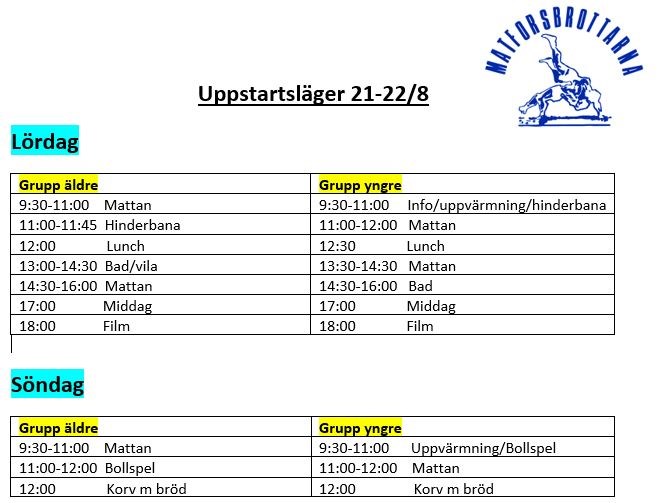 Här kommer en bild med ett preliminärt schema för uppstartslägret, scrolla om inte hela bilden syns. Vi träffas på hallen 9:30 på lördag. Måltiderna kommer förmodligen att serveras i andra lokaler så man behöver kläder för att gå emellan, ta även med badkläder och träningskläder såklart:-) Som det ser ut nu får vi inte sova över i hallen men vi kör ändå gemensam middag och film. Anmälan: Genom att svara ja på kallelsen på hemsidan. Badvakter: Vi skulle behöva några föräldrar som är med och badar på lördag em. Anmäl till Lars om ni har möjlighet. Frågor? Kontakta Lars på 070-661 93 68. Ev. matallergier anmäls till Cissi på 070-662 97 96 Nu ser vi fram emot en härlig uppstartshelg! /Matforsbrottarna Pass 1 10 aug 2021 0kommentarer