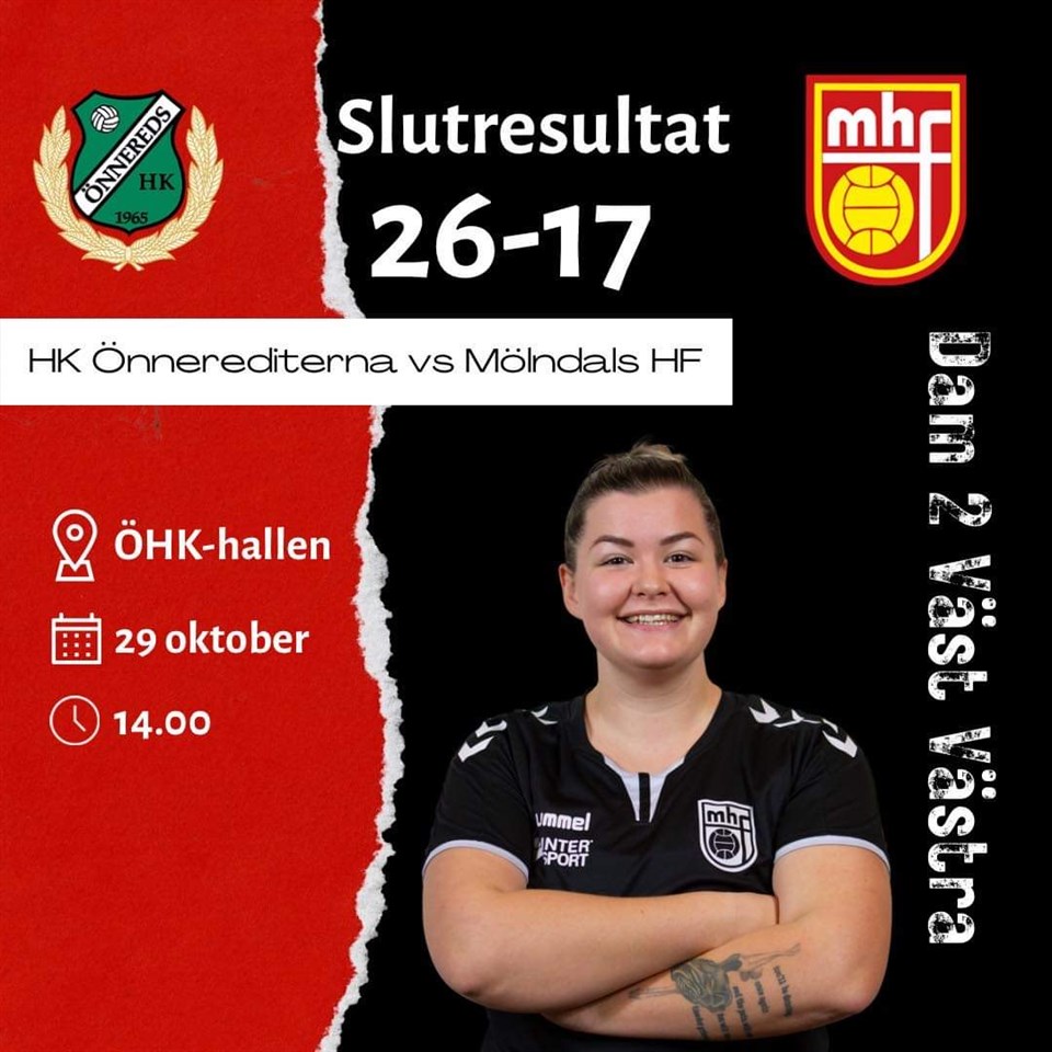 Mölndal förlorade mot Önnerediterna i division 2 Väst väst dam i handboll i ÖHK-Hallen. 26-17 (10-9) slutade matchen på lördagen. - Vi hade inte riktigt ork i 60 minuter, båda lagen spelar riktigt bra försvarspel och målvaktsspel i första halvlek. Det dröjer minst sex till sju minuter in i andra halvlek innan första målet kommer. Sedan åker vi på ett par onödiga utvisningar och det utnyttjar Önnered och får med sig några bollars ledning. Sedan orkar vi inte sista kvarten, kommenterade Mölndals tränare Halldor Halldorsson. Målgörare för Mölndal var Johanna Milos 6, Caroline Lundberg 5, Emma Svensson 2, Dalija Culum, Amra Fredholm, Emmy Hast och Ida Krafft. Senaste mötet lagen emellan, för tre år sedan, slutade med seger för Önnerediterna med 33-16. De båda lagen möts igen söndag 13 november 15.00, i Aktiviteten.