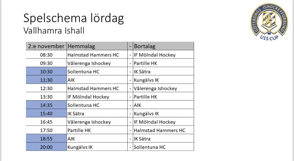 Spelschemat flr lördagen är klart. Se bilden till denna nyhet. Mölndals matcher: 8:30 Halmstad Hammers-Mölndal 13:30 Mölndal-Partille 16:45 Vålerenga-Mölndal Samtliga matcher spelas i Vallhamra. På kvällen när alla matcher är färdigspelade vet vi vilket slutspel vi hamnar i och om vi måste byta hall till söndagen. U16 1 nov 2024 0kommentarer