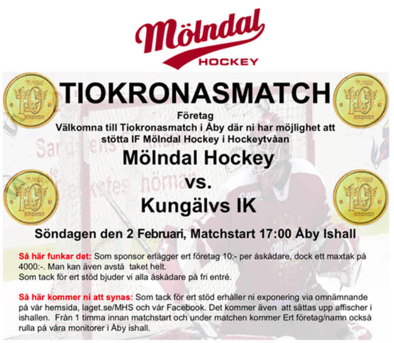 Söndagen den 2 februari är det dags för årets första 1/10-kronasevent i Mölndal hockey då vårt A-lag tar emot Kungälvs IK kl 17.00 i Åby ishall. Det kommer att vara hamburgegrillning, lotterier, puckkasstning, knattematch i pausen mm Gratis inträde! Vill du som företag eller privatperson vara med och sponsra Mölndal Hockey under detta event klicka på länken nedanför alternativt kontakta vårt kansli på: kansliet@molndalhockey.se Ta chansen att stödja Mölndal hockey genom att hitta ett företag som sponsrar eller sponsra själv som privatperson. Ladda ner blankett Företag, innehåller även instruktion hur sponsring med 10 kr/åskådare går till Ladda ner blankett Privatperson, innehåller även instruktion hur sponsring med 1 kr/åskådare går till
