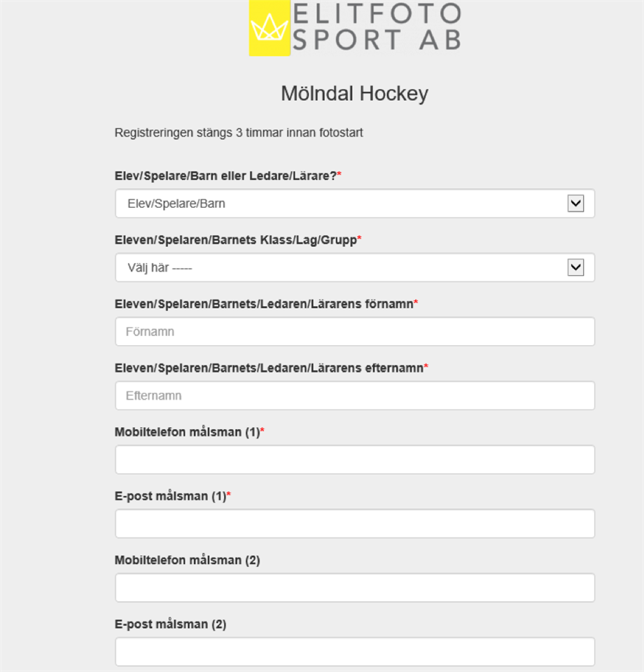 Hej! Fotograferingen är inlagd i kalendern. Glöm inte av att registrera innan! ATT GÖRA SENAST DAGEN INNAN FOTOGRAFERING Alla spelare och ledare skall senast dagen innan fotografering vara registrerade. Detta görs genom att använda följande länk. Väl inne på hemsidan väljer man Mölndal Hockey http://www.larsake.se/lamna-uppgifter-infor-fotografering/ Här registerar man in uppgifter, se bild 1. Välj om du är spelare eller ledare 2. Välj lagtillhörighet 3. Skriv in förnamn 4. Skriv in efternamn 5. Mobiltelefon till målsman 1 6. E-post till målsman 1 7. Mobiltelefon till målsman 2 8. E-post till målsman 2 *Spelar man i två lag behöver man registrera sig i båda, dvs 2 gånger Efter fotografering Mail skickas ut till angivna mail adresser. I mail finns inloggningskod angivet till spelare/ledares bilder och beställning kan göras. OBS! SPELARE/LEDARE KAN VARA MED PÅ KORTET UTAN ATT DET FINNS KRAV PÅ BESTÄLLNING