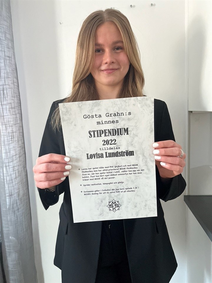 2022 år minnes stipendium gick till Lovisa Lundström. Hon har ett stort MSSK hjärta. Lovisa ställer alltid upp när det behövs och sprider glädje, kämpaglöd och motivation i både hockey och fotboll. Hon tar stora steg i sin utveckling som hockeymålvakt och har redan varit uttagen till U18 VM i Östersund som reservmålvakt på hemmaplan. Lovisa spelar nu i Luleå och vi önskar henne all lycka med sin satsning på hockeyn. MSSK