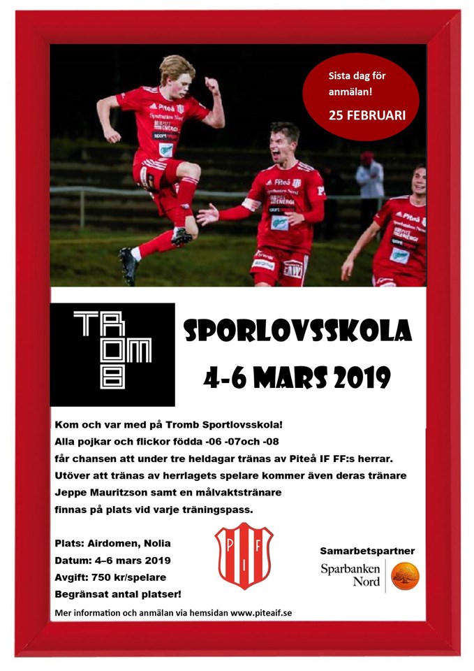Hej på er! Nu finns chansen att få spela fotboll under sportlovet, 4-6 mars kommer Piteå IF FF:s herrlag att anordna en Sportlovsskola. Det är flickor och pojkar födda -06 -07 och -08 som har chansen att få vara med. Utöver att tränas av herrlagets spelare kommer även deras tränare Jeppe Mauritzson samt en målvaktstränare finnas på plats vid varje träningspass. Detta ingår i Sportlovsskolan: 2 pass fotbollsträning/dag Lunch varje dag. Plats: Airdomen, Nolia Datum: 4–6 mars 2019 Avgift: 750 kr/spelare Begränsat antal platser! Anmälan kan göras online: https://sportadmin.se/form/form.asp?ID={46B25539-83C0-490B-8152-D1455A944E07}