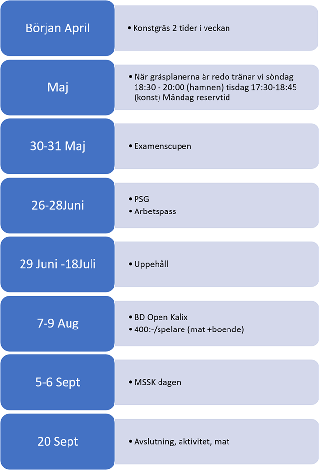 Hej. Här kommer information inför årets säsong. Nästa vecka, V11 är det klubbvecka för oss på sportringen. Ett önskemål är att skaffa årets overall (Adidas condivo) men är såklart helt frivilligt. Hjälp oss gärna med sponsorer för detta. I April hoppas vi få börja träna på konstgräset, dessa dagar och tider återkommer vi med. Så snart gräsplanerna är redo har vi träning Söndagar och tisdagar. Vi har även en reservtid Måndagar. Dessa tider kan användas för eventuella hemmamatcher. Som ifjol så siktar vi på ca 3 aktiviteter/vecka. Utöver seriespel kommer vi delta i Examenscupen, PSG, BD Open i Kalix samt MSSK-dagen. Efter PSG tar vi ett upphåll till den 18/7. BD open i Kalix innebär övernattning med mat och kostar 400:-/spelare. För mer detaljer se bilden eller dokumentet säsongen 2020 Allt eftersom vi får tider för träningar och matcher så lägger vi in det i kalendern. Undrar ni över något så är det bara ni hör av er. /tränarna