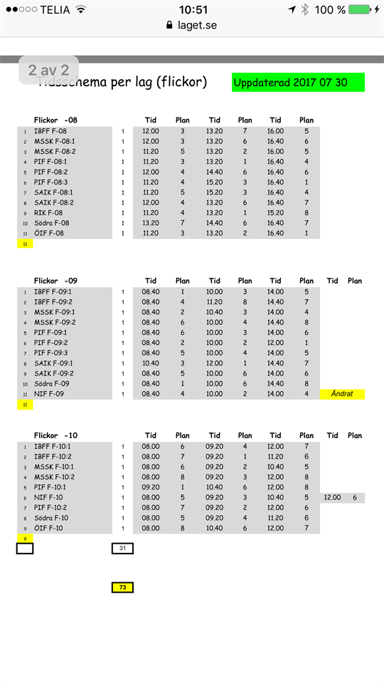 Hej alla! Här kommer uppdaterat spelschema från Bölebyns SK samt lagindelning för lördagens cup. Lag 1 Saga-Li, Ida, Molly, Meya, Ines, Astrid, Julia Matcher: 08:40 plan 2 mot Pif 2 10:40 plan 3 mot Saik 1 14:00 plan 4 mot Nif Lag 2 Klara, Svea, Tilde, Maida, Tella, Ingrid, Lo, Sanna Matcher: 08:40 plan 6 mot Pif 1 10:00 plan 4 mot Pif 3 11:20 plan 8 mot Ibff 2 14:40 plan 8 mot Södra OBS! Samling 30 minuter före varje match vid aktuell plan! Ta med kläder för lördagens svajande väder. Glöm ej tjejernas matchtröjor, vattenflaskor och benskydd. Ser fram emot lördagens cup! //tränarna