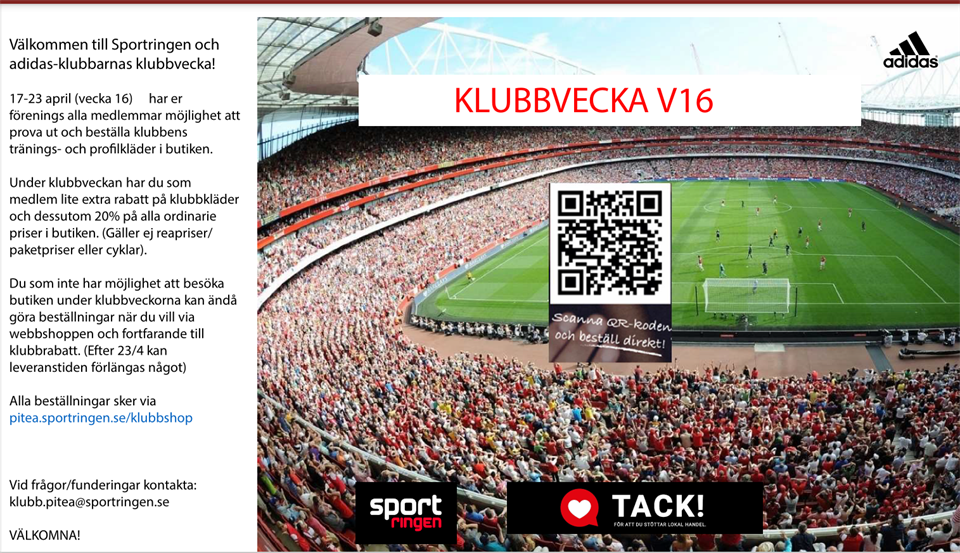 Tjena! Vecka 16, den 17 till 23 april, är det klubbvecka på Sportringen. Vi vill än en gång poängtera att det inte finns något köptvång! Alla beställningar görs via "Klubbshopen", gå in via länken. Klubbshopen // Tränarna