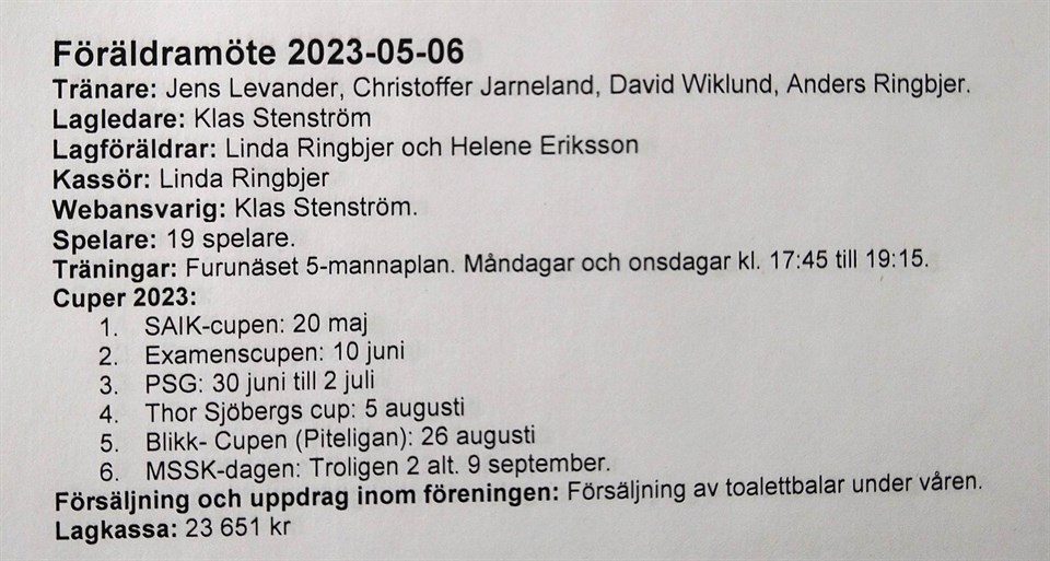 Tjena! Träningsmatch mot SAIK 13/5: Vi spelar med 2 lag och varje lag spelar 2 matcher. Plats: Idrottsparken Samling: 13:20 Matchstart: 13:50 Matchtid: 2 x 15 minuter Information från föräldramötet: Vg se bild. Vecka 19: Måndag: Träning, Parken klockan 18:00 - 19:15 Lördag: Träningsmatch mot SAIK. Fotbollsskor, benskydd, håret uppsatt i tofs och egen vattenflaska. Kommande: 15/5 Träning 20/5: SAIK-CUPEN 22/5: Träning 27/5: Träning