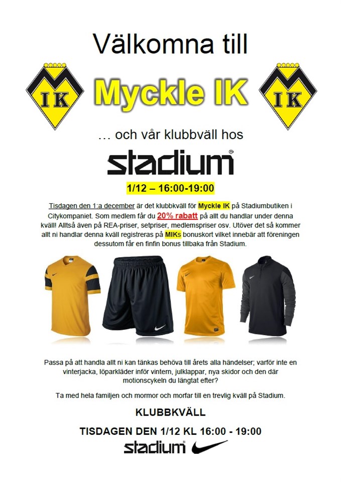 20 % rabatt på allt samt även reapriser mellan 16.00 - 19.00 Dessutom får Myckle IK en bonus på allt som köps under denna klubbdag! Herr 1 dec 2015 0kommentarer