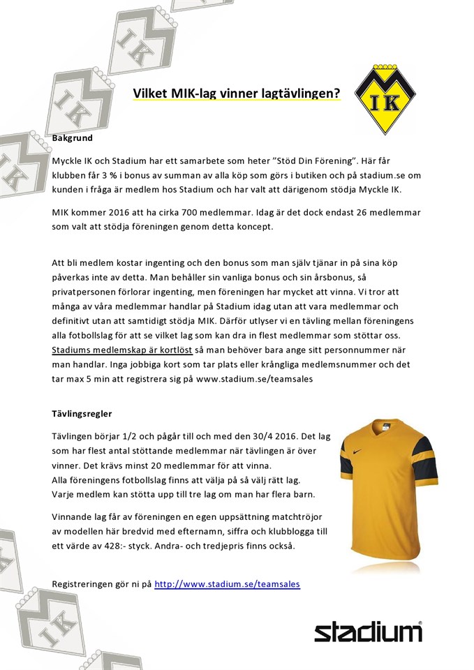 Tävlingen börjar 1/2 och pågår till och med den 30/4 2016. Det lag som har flest antal stöttande medlemmar när tävlingen är över vinner. Det krävs minst 20 medlemmar för att vinna. Alla föreningens fotbollslag finns att välja på så välj rätt lag. Varje medlem kan stötta upp till tre lag om man har flera barn. Vinnande lag får av föreningen en egen uppsättning matchtröjor av modellen här bredvid med efternamn, siffra och klubblogga till ett värde av 428:- styck. Andra- och tredjepris finns också. Herr 4 feb 2016 0kommentarer