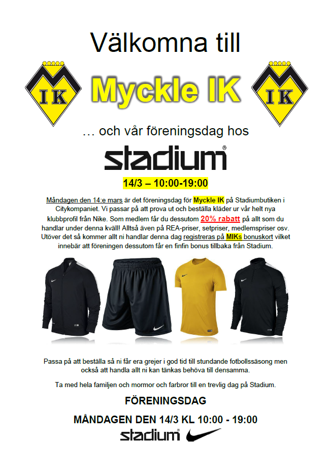 20 % rabatt på allt samt även reapriser mellan 10.00 - 19.00 Dessutom får Myckle IK en bonus på allt som köps under denna klubbdag! Herr 9 mar 2016 0kommentarer