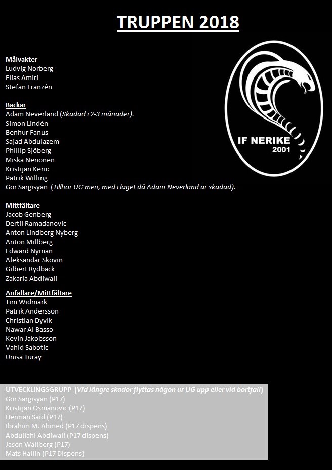 Andreas Brorson har nu fastställt truppen som ska sikta högt mot stjärnorna säsongen 2018! Nytt för i år är att vi har en utvecklingsgrupp. Spelare som spelar i vårt ungdomslag - P17, knackar på dörren in till A-laget, får vara med och träna med A-laget vid tillfällen. Nu kör vi! Forza Nerike! Fotboll A-lag 2 mar 2018 0kommentarer