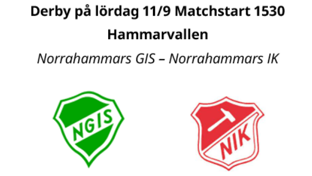 Hej På lördag 11/9 15:30 startar derbyt mellan NGIS-NIK. Grillen kommer vara igång och halva potten. Samtliga Barn & Ungdomar i NGIS får en godispåse som kommer på matchen. Varmt välkomna till Hammarvallen // Styrelsen genom Jonas Tingrud Norrahammars GIS 9 sep 2021 0kommentarer