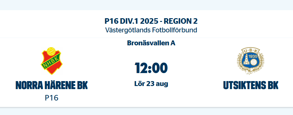 Det kan låta lite overkligt, men på lördag 12:00 möts Vårt Allianslag P16 och Utsikten BK P16! Utsikten är naturligtvis duktiga, men vi hoppas våra grabbar kan stå upp bra och att det blir en fin match. FRI ENTRÈ - bara att dyka upp på Bronäsvallen! Välkomna Länk till Serietabell: P16 Div.1 2025 - Region 2 Norra Härene BK 22 aug 0kommentarer