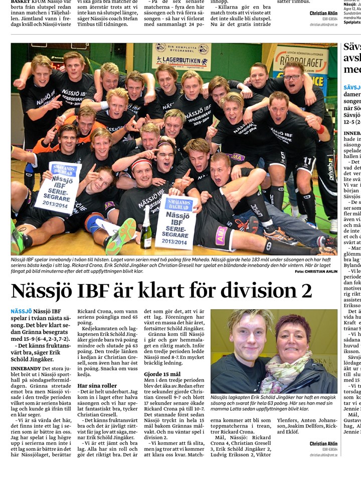 Då var säsongen 2013/2014 slut, min första som seniortränare för ett herrlag och den kunde ju inte ha slutat bättre. Det blev serieseger och direkt-uppflyttning till division 2 vilket känns helt underbart. Målsättningen när vi i höstas satt i en skolsal nere på Öland var väl att vi skulle slåss i toppen av serien och kampas om en plats upp till tvåan men att vinna en serie är inte lätt, speciellt inte en serie som är så pass jämn som denna varit i år. Jag ska försöka ta er igenom lite hur det har sett ut, mina tankar och funderingar under säsongen och slutligen kommer jag utse lite årets … trevlig läsning. Serien började med ett derby, Husar stod på andra sidan och vi fick en underbar start med en klar och ganska komfortabel seger. Annars var serieinledningen sådär från vår sida och vi blandade och gav mycket. Efter 8 matcher stod vi på 3 vinster, 1 oavgjord och 4 förluster och jag tror inte det var många som i det läget trodde på en serieseger. Jag har alltid trott på laget och det vi gjort men visst såg ett Moheda med idel segrar eller möjligtvis en oavgjord väldigt svåra ut att nå. Men sen hände något, bitarna började falla på plats och segrarna började trilla in. Man får inte glömma att vi inför säsongen plockade in ett helt koppel med nya spelare men det tar alltid ett tag innan alla bitarna faller på plats då. Med segrarna kom självförtroendet, en grym glädje och enligt mig en riktigt bra lagsammanhållning som jag ser som en utav våra främsta styrkor. Seger efter seger noterades, 3, 4, 5 raka och det bara fortsatte samtidigt som Moheda helt plötsligt börjat darra ordentligt. Poängen började på slutet att ätas in i en rask takt och så i den näst sista omgången passerar vi och efter att ha tillbringat hela säsongen som jagande skulle vi nu gå in i en sista omgång som den som blir jagad, den som ska försvara en serieledning istället för att komma ikapp någon annan. Det är inte lätt, att knyta ihop en sådan säck och visst är vi vissa stunder i matchen mot Gränna lite trevande men vi är så starka just nu och vi ska bara vinna. Några djupa ord i sista period-pausen och vi går ut i tredje och knyter ihop säcken, seger 15-9 och det har väl aldrig smakat så gott! Tio raka segrar blir det tillslut och hade säsongen haft fem matcher till så tror jag helt ärligt att det hade blivit femton så bra tycker jag vi är. Vinner man tio raka matcher så tycker jag att man med gott samvete kan kalla sig en värdig serie-segrare. Vad krävs då för att vinna en serie? Vad gjorde så att vi fick fira ordentligt i söndags? Jadu ett bra svar på det vet jag inte om det finns, eller det finns säkert en hel uppsjö med svar men inget facit. Vi har haft en grymt stark spelartrupp från början med många spelare med spetskompetens. Detta har gjort att vi har haft spelare som har kunnat kliva in och leverera om någon annan har en tung dag för sådana dagar har man. Vi har haft en förstakedja som har producerat grymt bra med Crona-Schöld-Gressel. Vi har varit förskonade från skador hela säsongen och kunnat spela med relativt orörda femmor vilket också gör sitt enligt mig. Vi har haft en bred trupp med hög träningsnärvaro. Sen återkommer vi till det här med glädje, lagsammanhållning och att göra det där lilla extra för sina lagkamrater och i slutändan tror jag det är de som avgör till vår fördel i denna jämna serie. Jag vill tro att det är så i alla fall. Lagfester hit och dit säger vissa men jag har en tro på att det har stor betydelse i ett lag att man gör saker tillsammans både på och utanför plan. En annan sak som har betytt grymt mycket är publiken och stödet. Vi har snittat 193 åskådare/match, tvåan i serien har snittat 93! I division 2-serien som vi kommer spela i nästa säsong hade vi också varit etta i år, före lag som Sävsjö och Olofström som tog steget upp i ettan, dom snittade bägge 163. Det säger ganska mycket om stödet vi har haft och vi tackar för det, verkligen. Bara att se till att ni hittar dit även nästa år när det kommer bjudas på ännu bättre innebandy i Nässjö sporthall, att snitta en bit över 200 nästa säsong känns fullt möjligt. Vår sista match följdes av ca. 400! Sen måste vi berömma och tacka vår styrelse som gett oss riktigt bra förutsättningar, träningsmässigt och materialmässigt med saker runtomkring våra matcher, nog så viktigt. Inte vinner man en serie för att man har bananer i omklädningsrummet säger ni men det är en del det med som gör allt lite mer professionellt tillsammans med massa annat. Vi har varit uppbackade av Unihoc i år med klubbor, overaller, väskor och allt annat och det är med något som enligt mig har fungerat riktigt bra och gett oss en extra dimension. Gemenskap, glädje, disciplin och respekt! Over and out! //Crille