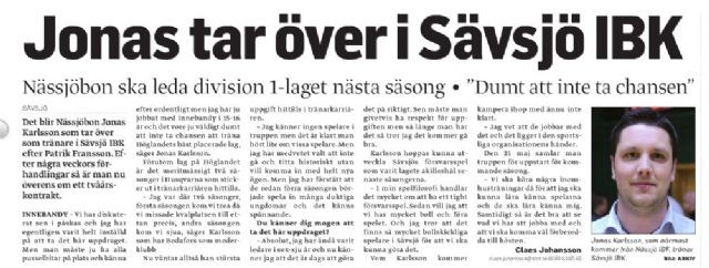 Jonas lämnar för Sävsjö´s Div 1 lag. Även Andreas Karlsson har valt att lämna inför komma säsong.