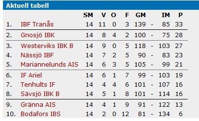 Derby mot Sävsjö IBK var det i Nässjö sporthall under söndagen. Förra mötet slutade inte så bra för våra tappra krigar men ikväll blev det annorlunda. Det var två stycken debutanter i dag Marcus Eriksson och Lukas Granström vilka bägge två får godkänt. Första perioden tog Sävsjö tag i taktpinnen från början och vi fick kämpa och slita. Runbom som var stod i målet räddade oss flera gånger under första perioden. Vi gör ganska oväntat 1-0 av Alexander Johansson på pass från Mikael Svensson efter 7.30. Sedan gör Sävsjö 1-1 och 1-2 på våra misstag då vi tappar bollen i mitten när vi är på väg framåt. 2- gör Anders bara några sekunder efter 1-2 målet och vi känner att vi är på gång. Men bara 16 sekunder senare gör Sävsjö 2-3 och det kändes lite tungt. 17.13 så får Mikael Svensson gå och sätta sig i utvisningsbåset efter en fasthållning. Sävsjö skapade flera men Runbom räddade och spelare täckte skott. Anders Fröderberg springer ifrån hela Sävsjö och de slår och håller i honom och domaren dömer straff. Anders slå straffen själv och det blir ett ursnyggt mål 3-3. En sammanfattning av perioden så hade Sävsjö mer boll och Runbom räddade medan vi gjorde mål på våra chanser vi fick. Andra perioden startade lite som den första att Sävsjö tog tag i spelet och vann de flesta en mot en situationerna. Lucas drog på sig en utvisning för lyftning av klubba och vi fick spela box igen. Vi klara boxen galant och vi spelar upp oss lite spel mässigt en stund. Men 11.52 kom 3-4 till Sävsjö vi var åter i underläge. 15.04 är det dags för Erik att sitta i utvisningsbåset men blir inte så länge för Sävsjö drog på sig en utvisning för slag 15.56. Under fyra mot fyra spelet blev det lite mer öppet spel och bägge lagen skapade lite chanser. 17.10 kommer en ganska tveksam utvisning på Glenn men sådant händer tyvärr på denna nivå. Även denna gång klara vi ett boxplay och det står 3-4 efter 40 minuter spelade. I andra perioden var det inte så bra innebandyspel och vi hade svårt att komma till i anfallsspelet. I defensiven räknade vi inte alltid rätt vilket gjorde att vi bjud på lite chanser Tredje perioden började kanon bra med mål redan efter 11 sekunder av Erik. Det kändes bra nu och positiv energi flödade på bänken. Vi ta över matchen mer och mer. Det ta bara 5 minuter till så har vi gjort 5-4 genom Anton på pass från Anders. Vi får sedan power play och för dagen så spelar Linné på Gundersens plats och det visade sig vara bra då vi gjorde 6-4 efter 40 sekunder i ppt. Sävsjö ta time out men det var inte bra för deras del för Cliff gör 7-4 29 sekunder efter Sävsjös time out. 9.13 får vi en chans till i power play och denna gång går det 15 sekunder innan Linné gör sitt andra mål i PP. 13.45 gör Sävsjö 8-5 och Glenn blev riktigt arg på domaren för han tyckte att spelaren stod i målvaktsområdet. Men det köpte inte domaren och gav Glenn 2 minuter för protest. Kan säga att alla i hallen såg att Glenn hade rätt. Vi klara av box spelet och när vi varit 5 man på banan i 6 sekunder gör Linné sitt hattrick 9-5. Anton gör 10-5 lite senare som blir slutresultatet. Tredje perioden ta vi över spelet och vi får betalt för vårt hårda slit. Alla gör en bra match men jag vill gärna lyfta fram Alexander Runbom som gör många fina och viktiga räddningar. Idag hade vi ett fantastiskt box play spel idag och en mycket bra power play spel vilket gör att vi vinner denna match samt att vi kämpar som ett lag