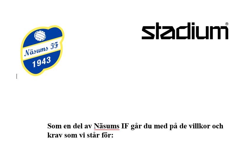 Näsums IF har med Stadium säsongen 2020 tecknat avtal som officiell sportleverantör. Vi ser att Stadium kan hjälpa oss i profilering och stödja föreningen på ett bra sätt inför framtiden. Vi ser fram emot ett bra samarbete, flera nyheter kommer under våren men boka redan nu in den 28/1 då vi kommer ha vår första utprovning tillsammans. //Styrelsen