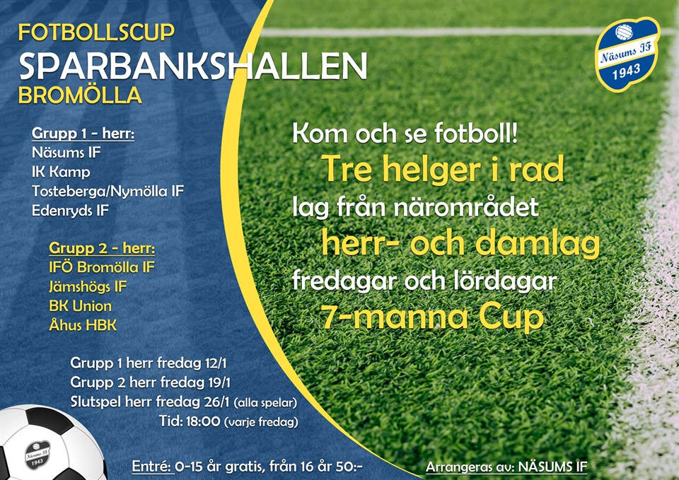 Fredag 26/1 Kvartsfinal 1 kl 18:00 IK Kamp - Jämshögs IF 1-2 (Efter förlängning) Mål Kamp: Dennis Barlow (Bonusstraff) Mål Jämshög: Jonathan Stark 2 Matchens Lirare: Jonathan Stark (Jämshögs IF) Kvartsfinal 2 kl 18:30 IFÖ Bromölla IF - Edenryds IF 6-2 Mål Bromölla: Danijel Maksimovic 3, Waseem Jafleh 2, Kays Alasad Mål Edenryd: Henrik Larsson 2 (Bonusstraff) Matchens Lirare: Danijel Maksimovic (IFÖ Bromölla IF) Kvartsfinal 3 kl 19:00 Näsums IF- BK Union 4-2 Mål Näsum: Joel Wernersson (Bonusstraff), Albin Wittzell, Max Wernersson, William Persson Mål Union: Hannes Andersson, Felix Karlsson Matchens Lirare: Albin Wittzell (Näsums IF) Kvartsfinal 4 kl 19:30 Åhus Horna BK - Tosteberga/Nymöllla IF 1-3 Mål Åhus: Joel Andersson Mot Tosteberga: Jawed Nadiri, Johannes Green, Jens Karlsson Matchens Lirare: Jawed Nadiri (Tosteberga/Nymölla IF) Semifinal 1 Kl 20:00 IFÖ Bromölla IF - Näsums IF 4-3 Mål Bromölla: Oscar Andersson 2, Joel Ottosson, Waseem Jafleh Mål Näsums: Joel Wernersson (Bonusstraff), Kim Thörnberg, William Persson Matchens Lirare: Kim Thörnberg (Näsums IF) Semifinal 2 kl 20:30 Jämshögs IF - Tosteberga/Nymölla IF 2-3 Mål Jämshög: Självmål, Jonathan Stark Mål Tosteberga: Mattias Häggström (Bonusstraff), Jawed Nadiri, Jesper Jeansson Matchens Lirare: Mattias Häggström (Tosteberga/Nymölla IF) Final Kl 21:15 IFÖ Bromölla IF - Tosteberga/Nymölla IF 3-2 Mål IFÖ Bromölla IF: Oscar Andersson, Kays Alasad, Joel Ottosson Mål Tosteberga IF: Mattias Häggström (Bonusstraff), Anton Larsson Matchens lirare: Filip Bustad (Tosteberga/Nymölla IF) Dagens domare: Mats Olsson Gustav Brolin Reer Sedji Bajrami Skytteliga Herr Dennis Barlow IK Kamp 5 Mål Elias Hallin Åhus Horna BK 4 Mål Wassem Jafleh IFÖ Bromölla IF 4 Mål Danijel Maksimovic IFÖ Bromölla IF 4 Mål Johannes Green Tosteberga/Nymölla IF 4 mål William Persson Näsums IF 3 Mål Henrik Larsson Edenryds IF 3 Mål Max Wernersson Näsums IF 3 Mål Jonatan Stark Jämshögs IF 3 Mål Jawed Nadiri Tosteberga/Nymölla IF 3 Mål Kays Alasad IFÖ Bromölla IF 3 Mål Oskar Andersson Ifö Bromölla IF 3 Mål Joel Ottosson IFÖ Bromölla IF 3 Mål Liam Tillberg Näsums IF 2Mål Malte Svensson Näsums IF 2 Mål Joel Wernersson Näsums IF 2Mål Jesper Jaensson Tosteberga/Nymölla IF 2 Mål Mattias Häggström Tosteberga/Nymölla IF 2 Mål Jens Karlsson Tosteberga/Nymölla IF 2 Mål Ahmed Yasin Hemande IFÖ Bromölla IF 2 Mål Hannes Andersson BK Union 2 Mål Joel Andersson Åhus Horna BK 2 Mål Albin Wittzell Näsums IF 1 Mål Kim Thörnberg Näsums IF 1 Mål Sanel Skenderi Edenryds IF 1 Mål Jesper Olsson Tosteberga/Nymölla IF 1Mål Anton Larsson Tosteberga/Nymölla IF 1 Mål Muhamed Alzyada IK Kamp 1Mål Junior Rosieré IK Kamp 1 Mål Victor Svensson IK Kamp 1 Mål Elias Gran IFÖ Bromölla IF 1 Mål Andre Stjärnstrand IFÖ Bromölla IF 1 Mål Elias Björk IFÖ Bromölla IF 1 Mål Timmie Liljegren BK Union 1 Mål Harry Carleke BK Union 1 Mål Mohamed Shehadi BK Union 1 Mål Felix Karlsson BK Union 1 Mål Fabian Sandgren Åhus Horna BK 1 Mål Edin Alic Åhus Horna BK 1 Mål Andre Leandersson Jämshögs IF 1 Mål Nouri Jemmali Jämshögs IF 1 Mål Sjävmål 2 Mål