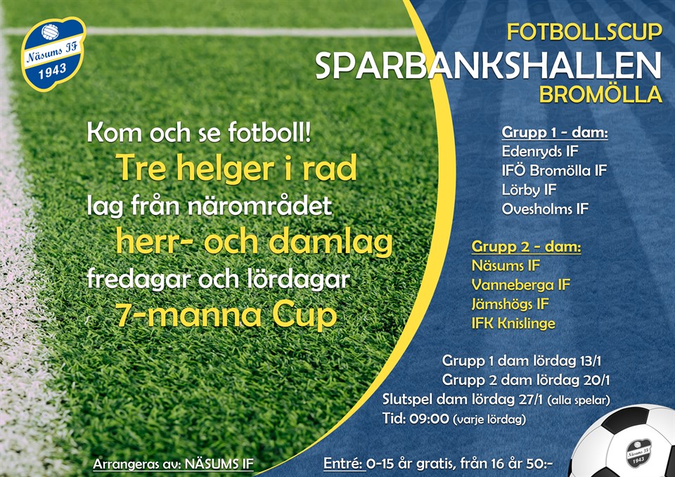 Lördag 20/1 Näsums IF - Vanneberga IF 2-3 Mål Näsum Erika Mjärdestam (Bonusstraff), Amanda Törgren, Mål Vanneberga Alicia Thim, Sofia Agrell, Elvira Molin Matchens Lirare Sofia Agrell Vanneberga IF Jämshögs IF/Olofströms IF - IFK Knislinge 6 - 1 Mål Jämshög/Olofström Isabella Axelsson 2, Viktoria Hallberg, Linnéa Olofsson, Thea Lewis, Julia Heiskanen Mål Knislinge Hanna Persson Matchens Lirare Isabella Axelsson Jämshögs IF/Olofströms IF Näsums IF- Jämshögs IF/ Olofströms IF 5-0 Mål Näsum Erika Mjärdestam 3 Amanda Törgren Wilma Hammarquist Matchens Lirare Erika Mjärdestam Näsums IF Vanneberga IF - IFK Knislinge 3-1 Mål Vanneberga Ellinor Olsson, Hanna Tegeborn, Moa Andersson Mål Knislinge Hanna Persson Matchens Lirare Hanna Persson IFK Knislinge IFK Knislinge - Näsums IF 2-4 Mål Knislinge Hanna Persson 2 Mål Näsum Maja Englund, Erika Mjärdestam, Ellen Olsson, Alicia Fleron Matchens Lirare Amanda Törgren Näsums IF Jämshögs IF/Olofströms IF - Vanneberga IF 4-0 Mål Jämshög/olofström Stina Svensson 2 (Bonusstraff) Linnéa Olofsson, Julia Heiskanen Matchens Lirare Stina Svensson Jämshögs IF/Olofströms IF Dagens domare Rebaz Omed Nader, Besnik Vilanca, Hamed Rahimi Tabell 1 Näsums IF 3 2 01 11-5 +6 6P 2 Jämshögs IF/Olofströms IF 3 2 0 1 10-6 +4 6P 3 Vanneberga IF 3 2 0 1 6-7 -1 6P 4 IFK Knislinge 3 0 0 3 4-13 -9 0P Skytteliga Grupp2 Erika Mjärdestam Näsums IF 5 Mål Hanna Persson IFK Knilsinge 4 Mål Isabella Axelsson Jämshögs IF/Olofströms IF 2 Mål Stina Svensson Jämshögs IF/Olofströms IF 2 Mål Linnéa Olofsson Jämshögs IF/Olofströms IF 2 Mål Julia Hieskanen Jämshögs IF/Olofströms IF 2 Mål Amanda Törgren Näsums IF 2 Mål Wilma Hammarquist Näsums IF 1 Mål Maja Englund Näsums IF 1 Mål Ellen Olsson Näsums IF 1 Mål Alicia Fleron Näsums IF 1 Mål Alicia Thim Vanneberga IF 1 Mål Sofia Agrell Vanneberga IF 1 Mål Elvira Molin Vanneberga IF 1 Mål Ellinor Olsson Vanneberga IF 1 Mål Hanna Tegeborn Vanneberga IF 1 Mål Moa Andersson Vanneberga IF 1 Mål Viktoria Hallberg Jämshögs IF/Olofströms IF 1 Mål Thea Lewis Jämshögs IF/Olofströms IF 1Mål