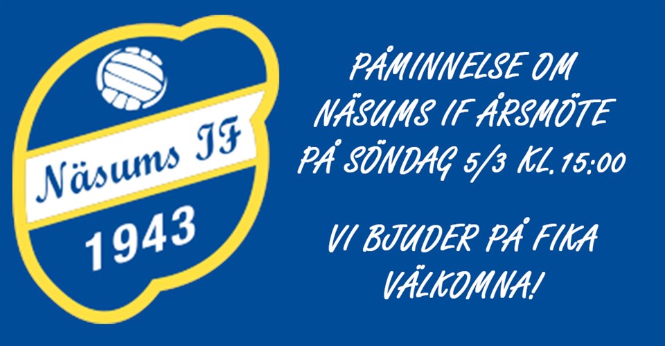 Påminnelse om Näsums IF årsmöte nu på söndag När: söndag 5 mars Tid: kl.15:00 Var: Församlingshemmet i Näsum Vi bjuder på fika - Välkomna!