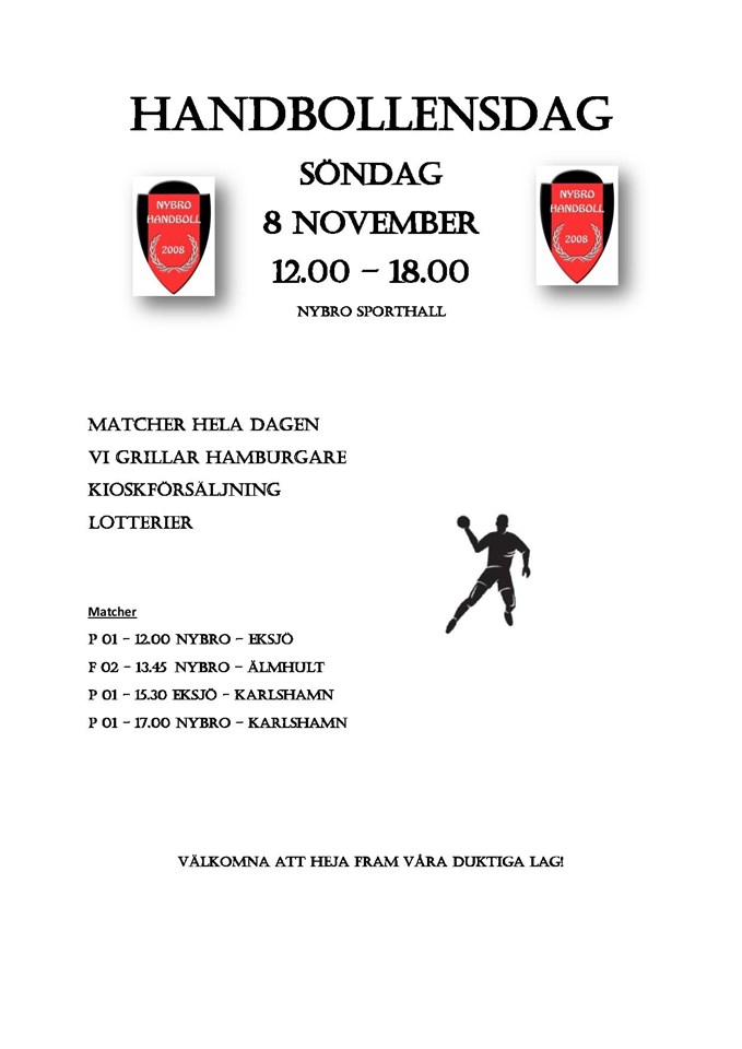 Nu på söndag, den 8 november, är det äntligen dags för Handbollens dag igen. Kom och titta och njut av en fartfylld dag fylld av spännande handbollsmatcher med våra duktiga lag, Vi tänder dessutom grillarna, fyller upp kioskerna samt anordnar trevliga lotterier. Vi ses i Nybro sporthall! Välkomna!